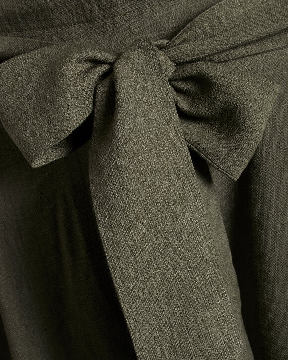Disse stilige og komfortable buksene i en elegant olivengrønn farge gir deg både avslappet og sofistikert stil. Med en høy midje og et praktisk knytebelte fremhever de figuren på en flatterende måte, samtidig som den løse passformen gir full bevegelsesfrihet. De lett foldede detaljene ved livet og rette buksebenene gjør dette plagget allsidig, perfekt for både hverdag og mer formelle anledninger. Laget av et lett og pustende materiale, er disse buksene ideelle for både varme dager og svale kvelder. Kombiner dem med en skjorte for en elegant look, eller en enkel t-skjorte for et mer avslappet uttrykk.